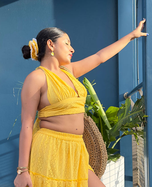 Aria Yellow Halter Neck Schiffli Top